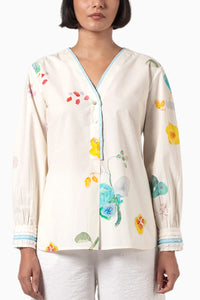 Featuring Multi Sidney Top from Shades of India by Cinnamon Collection. This exquisite top showcases an intricate floral print on a natural poplin base. Delicate pleated details, is further adorned the neckline and cuffs, adding a touch of textural intrigue.