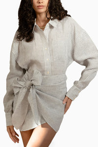 Featuring the Multi Stripes Oversized Shirt with Wrap Skirt from Nyasa Bee. A divine fusion of elegance and charm that promises to exude glamour with every step you take. Together, these pieces form a harmonious union of sophistication and whimsy, creating a look that is both striking and enchanting.
