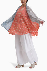 Featuring Multi Sunkissed Tunic with Trouser by Jayati Goenka from the Sunkissed Collection. A three-piece set of block-printed cotton traditional style wrap tops paired with printed no-sleeve tops and soft finished cotton silk-like white trousers with pockets. The tunic and the trousers are minutely detailed with handwork in golden thread and signature handmade buttons.