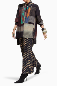 Featuring Multi Surmai Atri Shirt and Trousers by Aseem Kapoor from Beyond Ken-3 Collection. This ensemble includes a printed straight shirt with an embroidered collar and yoke, paired elegantly with printed wide-leg trousers. The shirt features a printed collar adorned with black and white bead detail, complemented by highlighting on the yoke. Both pieces offer an easy fit, with the trousers featuring an elasticated waist for comfort and style. Perfect for a versatile and chic look that effortlessly combines intricate design with relaxed elegance.