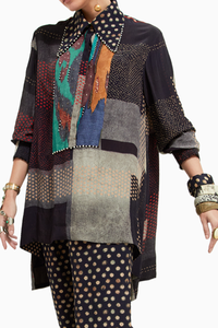 Featuring Surmai Atri Straight Shirt by Aseem Kapoor from Beyond Ken-3 Collection. This printed straight shirt boasts an embroidered collar and yoke, featuring a printed collar with black and white bead detail. Designed for comfort, it offers an easy fit that combines effortless style with intricate detailing.