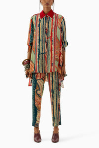 Elevate your ensemble with the Multicolor Atri Shirt and Trouser Set. The irregular stripe print shirt in natural crepe, paired with linen satin straight pants, offers a relaxed-fit sophistication. Embellished collar detailing with mother-of-pearl embroidery adds exquisite charm.