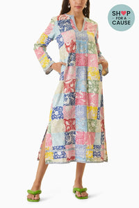 Featuring the Multicolor Patchwork Kashmir Dress, crafted from upcycled hand block printed cotton fabrics. This oversized dress boasts a V-neckline, wide elbow-length sleeves, convenient side pockets, and stylish side vents at the hem, combining comfort with unique artisanal charm.