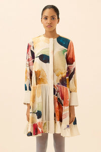 white mul fabric dress with a vibrant, abstract water color print in shades of pink, blue, and orange. It features a relaxed fit with long sleeves, a button-down front, and a ruffled hem for a fresh, playful look.