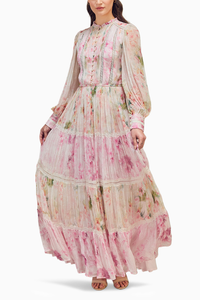 Featuring the Multicolor Placement Print Long Dress from Roseroom's Spring 2024 Collection. This captivating long dress, crafted from French chiffon, boasts a vibrant multicolor rose print, adorned with delicate lace insertion for an elegant touch.