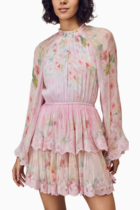 Featuring the Multicolor Printed Short Dress with Bell Sleeves from Roseroom's Spring 2024 Collection. This vibrant piece, crafted from French chiffon, showcases a captivating multicolor floral print. It features scalloped lace detailing and trendy bell sleeves, adding flair to your look.
