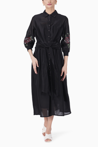 Featuring a multicolor rose printed sleeve tie-up dress tailored in silk chanderi.