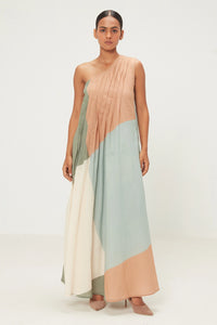 A one-shoulder maxi dress in lightweight cotton mul, designed with color-block panels in soft earthy pastel tones. The pleated neckline adds structure while the fluid, flared silhouette moves with ease. Finished with side pockets, this dress blends statement style with everyday comfort - ideal for both day wear and evening outings.