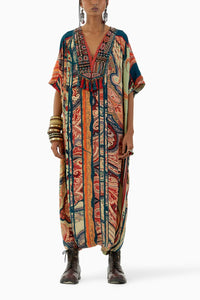 Unveil charm in our Multicolor Vayu Jumpsuit. The Multi Print Jumpsuit Kaftan, adorned with embroidered dori and resham thread details at the neck, features an anti-fit silhouette and a metal zipper back opening. Crafted from natural crepe.