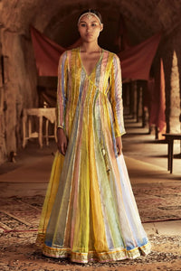Featuring the Multicolour Gold Jahaan Angrakha Pant Set by ITRH's Tirth collection. This set features a silk organza khadi block-printed, paneled angrakha reinforced with lampi strips, bordered with kadhi and lampi. The inner is a handmade metallic stripes bralette paired with fitted pants in cotton lycra.