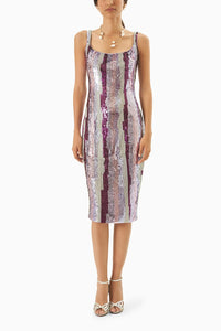 If you tend towards a more classic look, this dress is an excellent investment that'll blend in a sophisticated wardrobe. The silhouette is fitted with thin straps and a deep scoop neckline with intricate sequin work. Pair with vintage-inspired shoes to match the aesthetic of this dress.