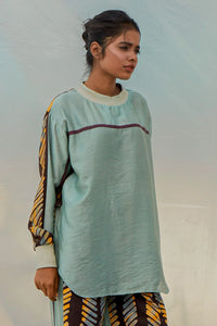 An ocean green front with a multi-color back with stroke print. The sweatshirt is made in chanderi silk with cotton rib neck and wrist bands. A linear band across the chest. Elevated athleisure.