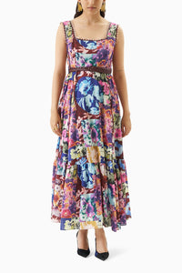 Featuring a coccifera printed flower cluster dress with hand woven fake leather belt.