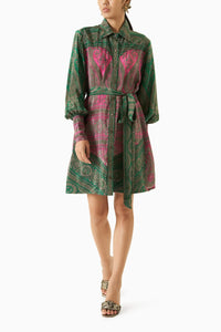 Kartikeya's creative spirit and artisanal focus defines this outfit. The easeful column shirt shilhouette is cut from crepe with vibrant print in fuchsia & green colour throughout and is elegantly styled with a collar neckline, monogram buttons and detachable belt. Keep your styling minimal with a tote bag and black sandals.