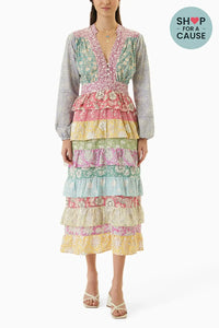 The Mumbai Dress is handcrafted using three different hand block printed fabrics. This dress is adorned with buttons at the top, fitted at the waist and features ruffles at the bottom.