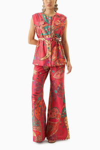 The perfect amalgamation of style & comfort, this printed multicoloured set with fuchsia base is perfect for a day out. Cut in chanderi silk it features round neckline, sleeveless style with patch pockets and waist tie-up belt. It is paired with matching flared pants. Adorn a pair of statement earrings with this look.