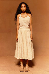 The Muryo Embroidered Skirt features a beautifullydetailed full embroidery on luxurious chanderi fabric,with a flowing circular cut and an elasticated backwaistband for a relaxed fit. This effortlessly chic skirtpairs seamlessly with any blouse, making it a versatile