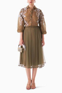 Featuring an elegant blend of Organza & Dotted Net, the Botanica mushroom embroidered shirt and skirt set exudes delicate charm. The organza shirt is adorned with thread embroidery and 3D leaf appliqué, finished with contrast buttons and double organza lining. Paired with a fully lined, gathered dotted net skirt with a side zipper and flattering A-line fit, this set offers a graceful and whimsical silhouette.
