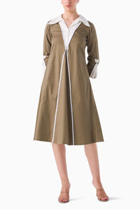 Featuring a Cotton Poplin Mimi mushroom embroidered midi dress in a classic A-line silhouette. It showcases a white linen yoke with delicate lace insertions, butterfly hand-embroidered appliqué on the sleeves and back, a stylish double collar in front, and a box pleat detail at the back—blending charm with thoughtful craftsmanship.