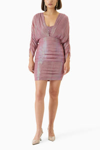 Mushy Love has its inspiration from romanticism. The style has got beautiful romantic details - Romantic Kimono sleeves and pleat setting from shoulder to waist crafted in vibrant metallic pink, shaped at the waist and then ruched fitted dress adds to the oomph factor of the dress.