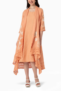 Become the walking canvas in luxurious linen. A free flowing jacket paired with a fitted dress with 3/4th sleeves and Inspired by oil paintings, the Tulip Painting range is exquisitely handcrafted with abstract motifs of the beloved tulip- hand screen printed with elegant thin lines of heat-pressed craft to the fabric and finished with delicate lace details culminating in a glorious homage to the bloom of love.