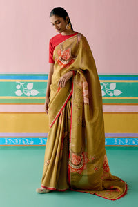 Vibrant and graceful, the Mustard Chintz Saree features a rich mustard base with a red chintz print. Finished with beaded metal tassels on the pallu and a contrast facing along the border, this saree beautifully blends tradition with contemporary elegance for a festive statement.