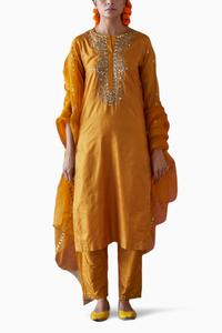 Featuring our mustard silk embroidered kurta set, designed to make a statement. Paired with complementing pants, this ensemble radiates elegance and sophistication. Complete your look with the embroidered organza dupatta, adding a touch of finesse to your outfit. Perfect for those seeking refined style with a touch of traditional charm.