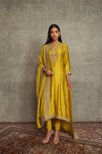 Featuring a mustard kurta in silk base with zardozi embroidery. It is paired with matching churidar pants and a dupatta. The set is crafted with the finest materials and will accentuate the look.