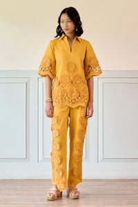 Make a statement in this mustard floral co-ord set featuring a collared shirt with crochet flower patches on the sleeves and lower half. Scallop detailing adds charm to the sleeves and hem. Paired with straight pants accented with a side crochet flower patch for a coordinated finish.
