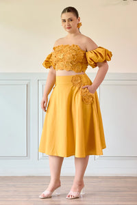 Turn heads in this mustard floral skirt co-ord set, featuring a tube crop top with attached puff sleeves and crochet flower patches all over. Paired with an elegant A-line midi skirt, detailed with floral patches along the pocket lines for a playful yet refined finish.