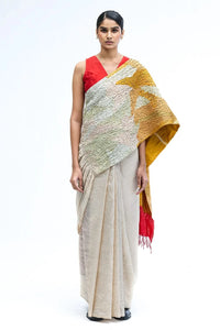 Handwoven metallic silk saree featuring fragments of tonal metallic textures with an engineered pallav. The saree comes with an unstitched silk blouse piece.