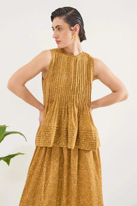 A sleeveless flared top that captures effortless grace, crafted from ultra-soft hand-dyed cotton mul-mul in a warm mustard tone, scattered with ivory dot prints. The silhouette features a round neckline with a clean edge finish and symmetrical pintucks running vertically from the shoulders to the waist, adding subtle structure and visual interest. At the hem, a wide band of horizontal pintucks enhances the flared shape, as seen in the intricate detailing. The lower bodice gathers softly at the waist, offering a fluid, peplum-like flare that flatters all body types. Pair it with the coordinating skirt for a co-ord look or style it over neutral culottes, wide-leg trousers, or denim for everyday elegance.