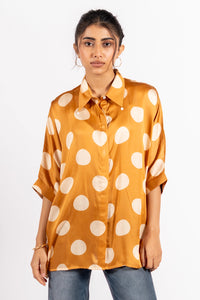 Featuring the Moondust Shirt by URAIB's A/W'25 Collection. Crafted in luxurious satin fabric, this front-open shirt stands out with its bold polka dot print in deep green and cream hues. Designed for a relaxed fit, it combines playful sophistication with effortless elegance—perfect for both casual outings and chic evenings.