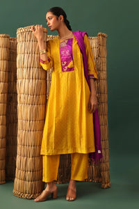 Featuring Bandhani on silk kurta with a patchwork yoke and sleeve borders. Box pleats run from top to bottom on both sides of the kurta, that add a fitted yet flared look. The kurta comes clubbed with silk pants in mustard and silk dupatta in purple.