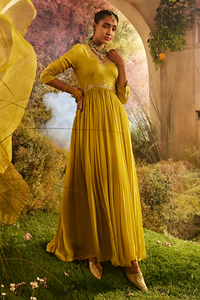 Step into elegance and grace with this stunning Silk Long Kurta Set, featuring a flowing ghera in chinnon fabric and adorned with intricate hand embroidery. The dress is crafted in a gathered style that exudes sophistication, complemented by a choli cut that accentuates the waistline and adds a touch of allure to the ensemble. The back and neck patterns are highlighted with delicate embroidery, enhancing the dress's appeal and creating a captivating visual effect from every angle. Accompanying the dress is a dupatta made from sheer organza and meticulously adorned with complete hand embroidery on all four sides.