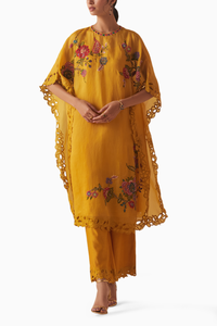 Step into elegance with our Mustard chanderi embroidered, cutwork and beadwork kurta with mustard chanderi organza detail pants, this ensemble is a celebration of craftsmanship and style.