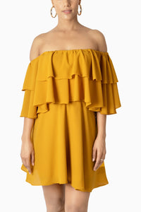 Featuring Mustard Yellow Amber Dress by Kiran Gupta Label. Meticulously crafted in Korean Double Georgette, this off-shoulder skater dress is in mustard yellow and comes with layers that merge with exaggerated shoulders to create some drama.