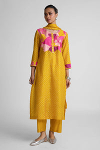 This is a patchwork yoke suit set in mustard yellow. The kurta comes embellished with hand embroidered mirror work on the placket. The silk organza stole comes lined with a bandhani edging.