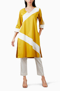 This V-neck kurta combines vibrant mustard yellow with crisp off-white in a sleek, two-tone design, enhanced by a side slit and three-quarter sleeves with gold zippers and off-white cuffs with gold trim for a luxurious touch. Paired with straight-fit ankle-length pants in pure off-white fabric, the elastic back waist ensures comfort, while side pockets and a gold-trimmed side zip add sophistication and practicality.