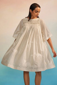 The Musubi Smocking Dress is a graceful blend of artistry and ease. Crafted in hand screenprinted silk Chanderi with delicate appliqu, it flows gently over the body, offering both comfort and refinement.Intricate smocking on the front and back yoke adds texture and subtle dimension, while, flowing sleeves create an airy, relaxed silhouette. Designed to move with you, this dress is perfect for moments when effortless elegance is key.