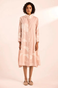 A fluid, high-collar shirt dress with a soft A-line fit. It features a concealed placket, side seam pockets, and delicate florals—balancing structure with effortless ease.