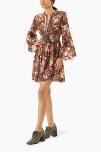 The mini dress ha s ea sy summer a ppea l, cra fted from printed cotton a ngla ise a lluring flora l print. Neckline finished with dra wstring a nd ha nd-ma de ta ssels a nd bea ds. Contra st colour deta iling a dds to the style.