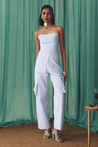 Effortlessly chic and refreshingly modern, this strapless jumpsuit is your go-to for summer sophistication. Designed in a soft blue-and-white pinstripe pattern, it features a clean, tailored silhouette that elongates the frame. The bandeau-style bodice flatters the neckline, while the wide-leg pants offer comfort and style in equal measure. Functional patch pockets with subtle pleated detailing add a utilitarian edge, making this piece as practical as it is polished.