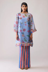 Featuring a relaxed silhouette with bell sleeves and a contrasting striped panel at the hem and cuffs, our Myla kurta set is beautifully accented with delicate gold hand embroidery and lace patchwork details. Made from an organza kurta layered over a shantoon slip and paired with cotton satin wide-leg striped pants or a striped dhoti, this lightweight and breezy ensemble offers a colorful, fresh take on festive dressing.