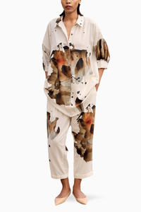 Featuring an off white art printed mul co-ord set. The tunic comes with lapel collars, front button opening and drop shoulders. Comes with regular trousers with front button opening and side seam pockets.