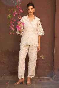 This lace co-ord set is the epitome of understated elegance, crafted in a pristine white cutwork lace fabric that exudes femininity and grace. Featuring a relaxed yet refined silhouette, it falls effortlessly to a scalloped hemline, adding a delicate touch of detail.The intricate floral cutwork embroidery creates an airy, breathable texture, making this dress perfect for summer soirées, brunches, and vacation getaways. The shirt style keeps it classic, while the soft lining ensures comfort without compromising on the sheer beauty of the lace.