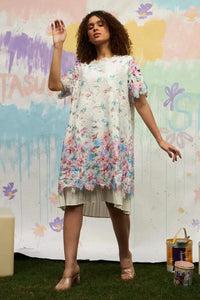 This Myra Mesh Iris Lace Dress in color White is a beautiful dress made by twisting together very fine threads of cotton to form floral pattern all over it. The dress itself is the work of art which is made delicately. The blue and pink flower pattern at the hem, sleeves and back makes the dress even more attractive. It is an easy-breezy dress, very comfortable to carry and is not at all heavy on the body. The soft color of the dress makes perfect for the season.