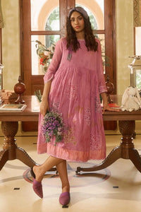 Hand woven chanderi dress with very fine pintuck detail enhanced with hand block print, detailed with hand embroidery. comes with a 100% cotton slip.