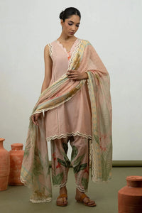Step into timeless elegance with the Myrrh Pink Kurta Set, featuring a relaxed cotton silk kurta paired with a slim salwar and a matching Chanderi dupatta. Finished with delicate appliqué lace embroidery, this set offers effortless sophistication for any special occasion
