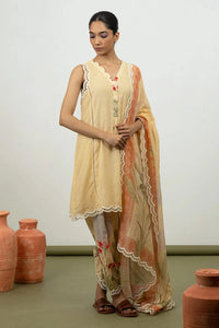 Step into timeless elegance with the Myrrh Yellow Kurta Set, featuring a relaxed cotton silk kurta paired with a slim salwar and a matching Chanderi dupatta. Finished with delicate appliqué lace embroidery, this set offers effortless sophistication for any special occasion